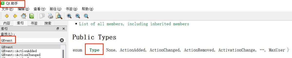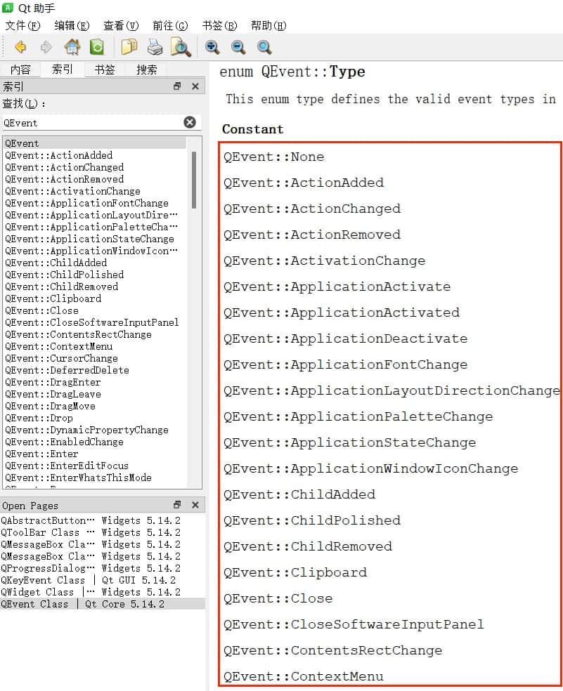 Qt 中的事件是封装在 QEvent类 中,在 Qt 助⼿中输⼊ QEvent 可以查看其所包括的事件类型,如下图示: