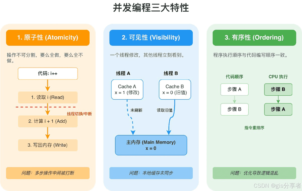 原子性、可见性、有序性是 Java 并发编程的三大核心特性,任何并发 bug 基本都能归到这三类里面。