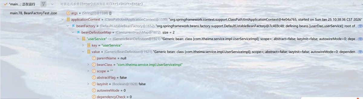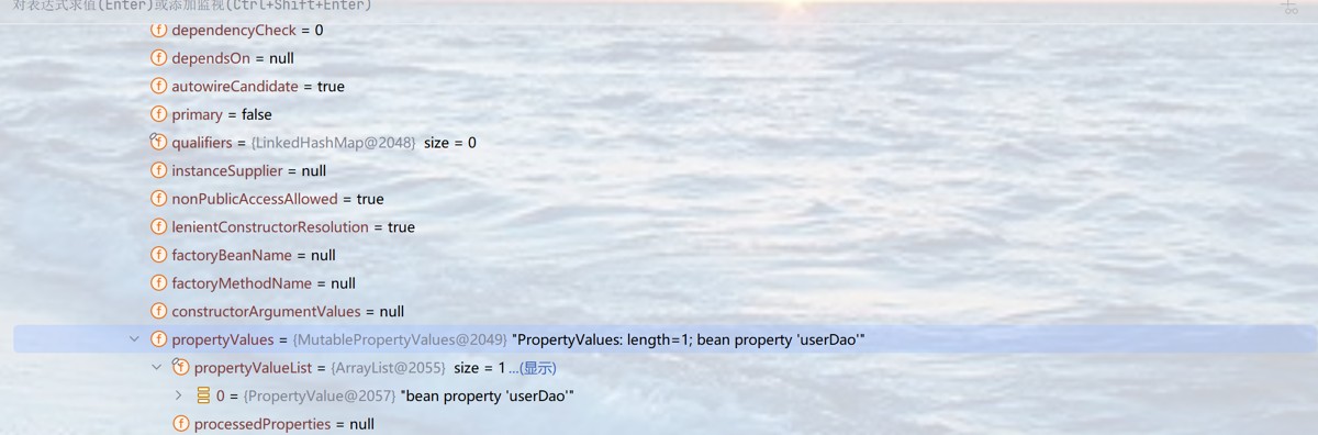 }此时由于xml中的userService没有传入属性,所以beanDefinitionMap中它的propertyValues为0: