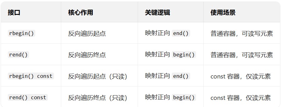 反向迭代器的 ++ 对应内部正向迭代器的 --,实现 “向后移动”(在反向遍历中是向前走)。