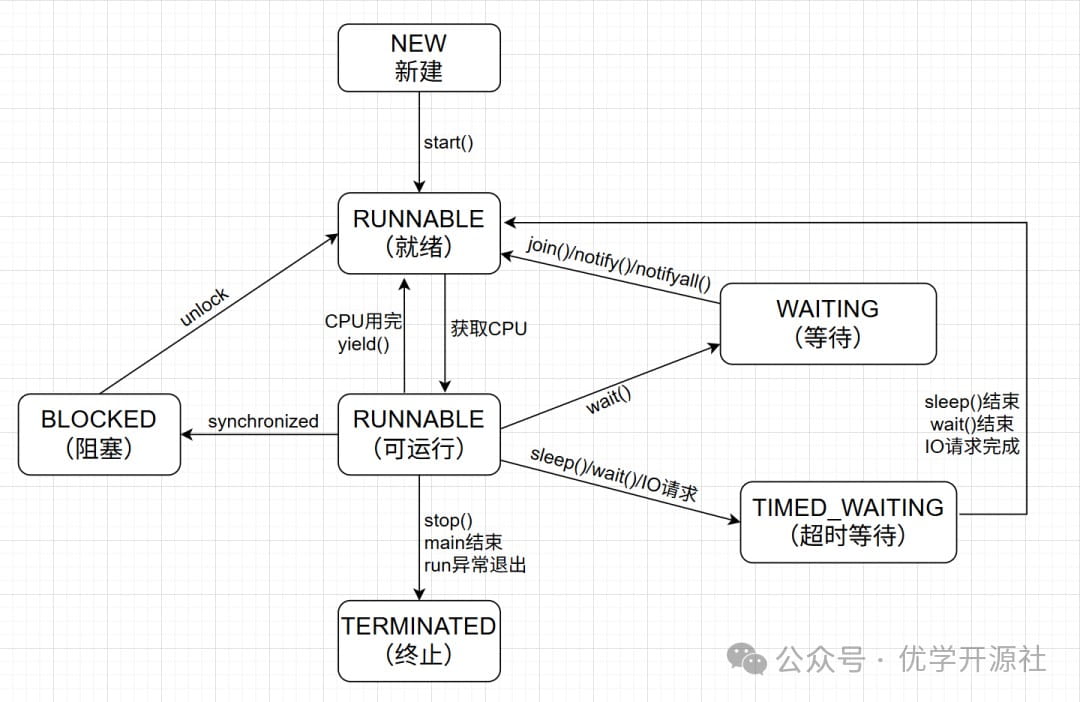 - RUNNABLE 状态 ≠ 正在执行:RUNNABLE 包含 “就绪” 和 “运行中” 两种情况,只有获取到 CPU 时间片的线程才会真正执行。