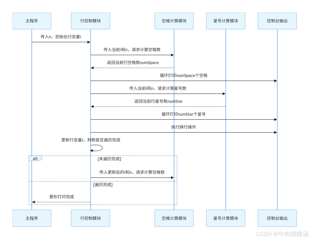i控制当前是哪一行,j用于打印前导空格,k用于打印星号。 - 下半部分的逻辑与上半部分相似,只是行数是从大到小递减。