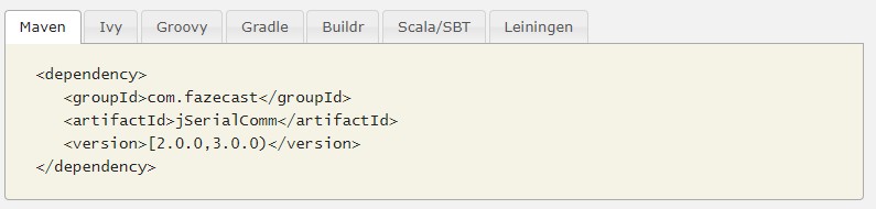 <dependency> <groupId>com.fazecast</groupId> <artifactId>jSerialComm</artifactId> <version>[2.0.0,3.0.0)</version> </dependency>