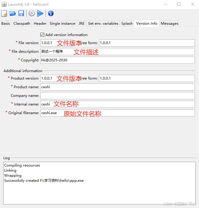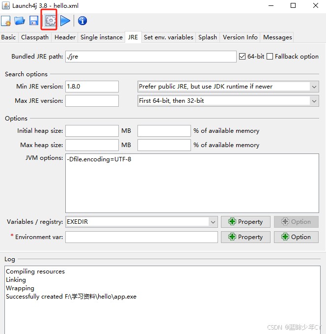 Save Configuration),保存为XML文件(便于后续修改)。 - 构建EXE:点击工具栏齿轮图标(Build Wrapper),生成EXE文件。