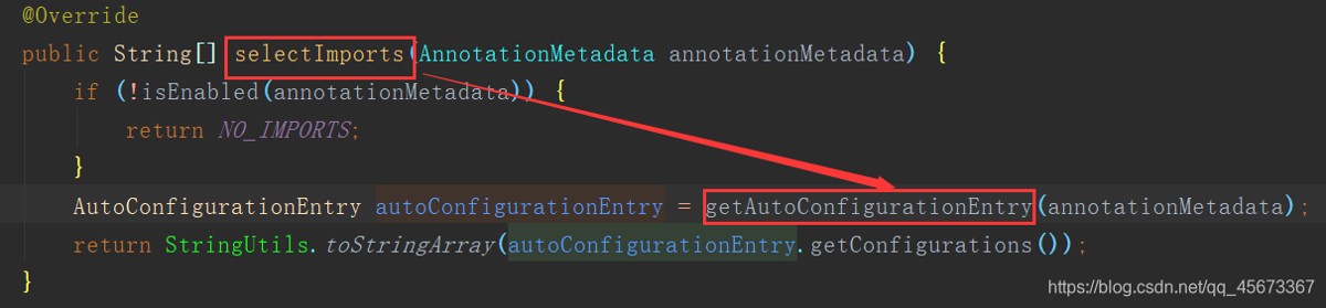 该类中有selectImports()方法,调用了getAutoConfigurationEntry()