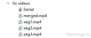 在很多视频处理场景中,我们会将一个录制任务拆成多个小片段(如 seg1.mp4、 seg2.mp4、 seg3.mp4 等)。多个分片合并成一个完整视频是一个常见需求。