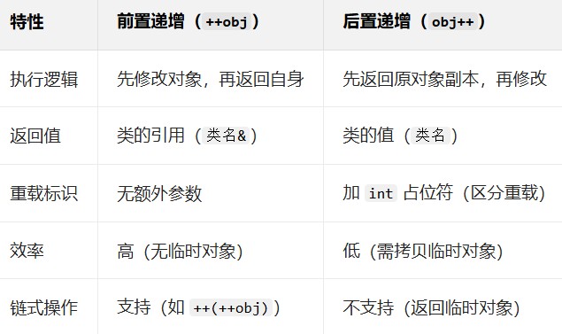 在 C++ 中,递增运算符(++) 分为前置递增(++obj) 和后置递增(obj++),两者语义不同,重载方式也有明显区别。递增运算符是单目运算符,通常重载为类的成员函数(更符合语义,因为操作数是类对象本身),也可重载为全局函数(极少用)。