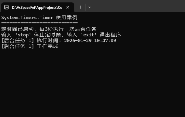 Console.WriteLine("定时器已启动,每3秒执行一次后台任务");