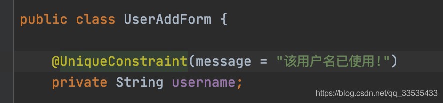 UniqueConstraintValidator类必须实现ConstraintValidator接口initialize方法以及验证方法isValid- 具体的校验逻辑在