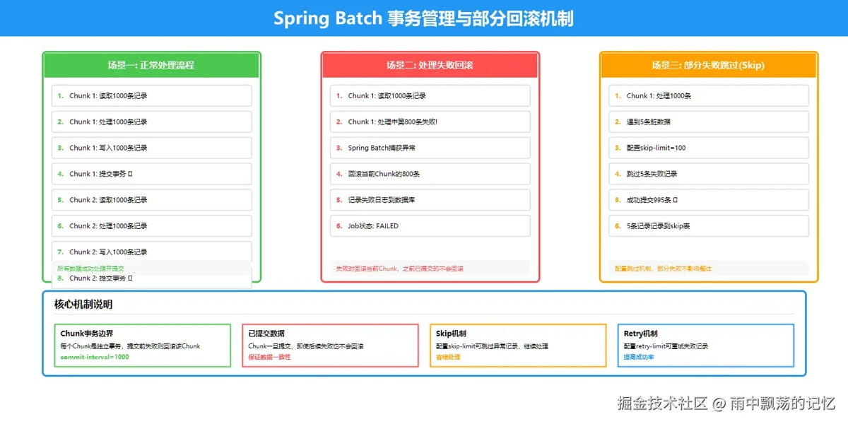 想象一下:你需要处理50万笔工资代发,如果第49万笔记录因为银行卡号错误而失败,在没有部分回滚机制的情况下,前面489,999笔已成功处理的数据会全部回滚!这对于业务来说是不可接受的。