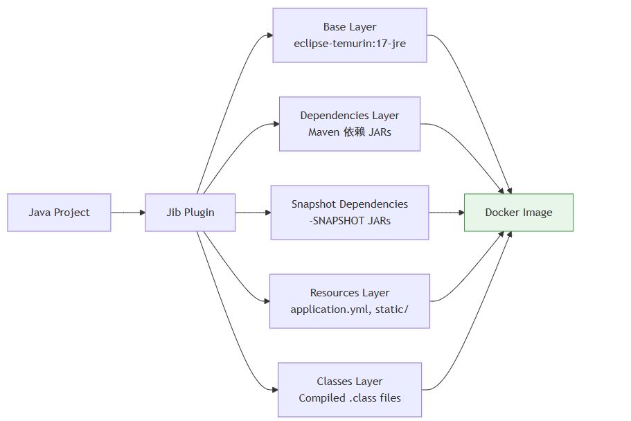 dependencies、snapshot dependencies、resources、classes多层,仅变更代码时只需上传少量层。 - 安全:不依赖本地 Docker,避免权限问题。