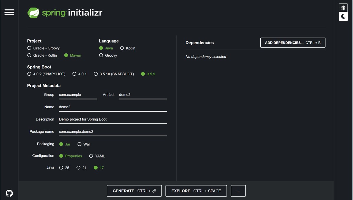 IntelliJ IDEA(旗舰版)内置了 Spring Initializr 集成功能,可直接对接官方https://start.spring.io 服务器,无需手动打开浏览器,是日常开发中最高效的方式。
