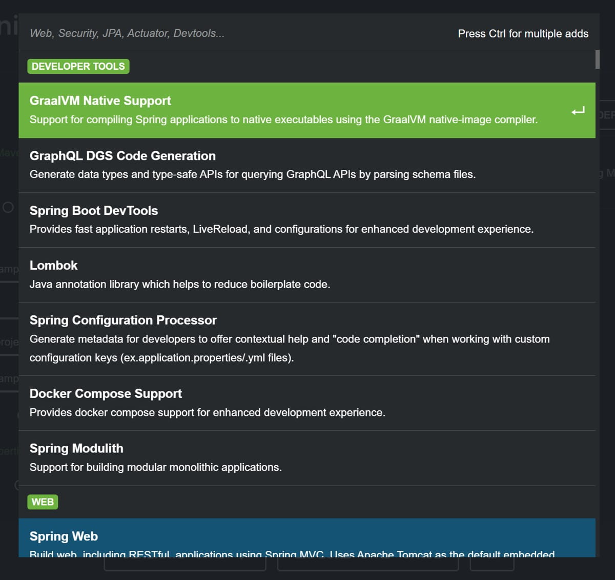 - 添加依赖:点击 ADD DEPENDENCIES,搜索并勾选 Spring Web 等所需模块。