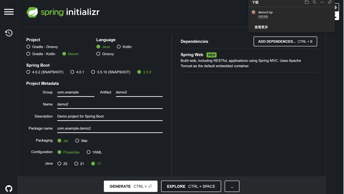 Spring Web并勾选(核心 Web 开发模块),按需添加 MyBatis、MySQL Driver 等其他依赖; - 点击页面底部「生成」按钮,下载项目压缩包(后缀为 .zip);