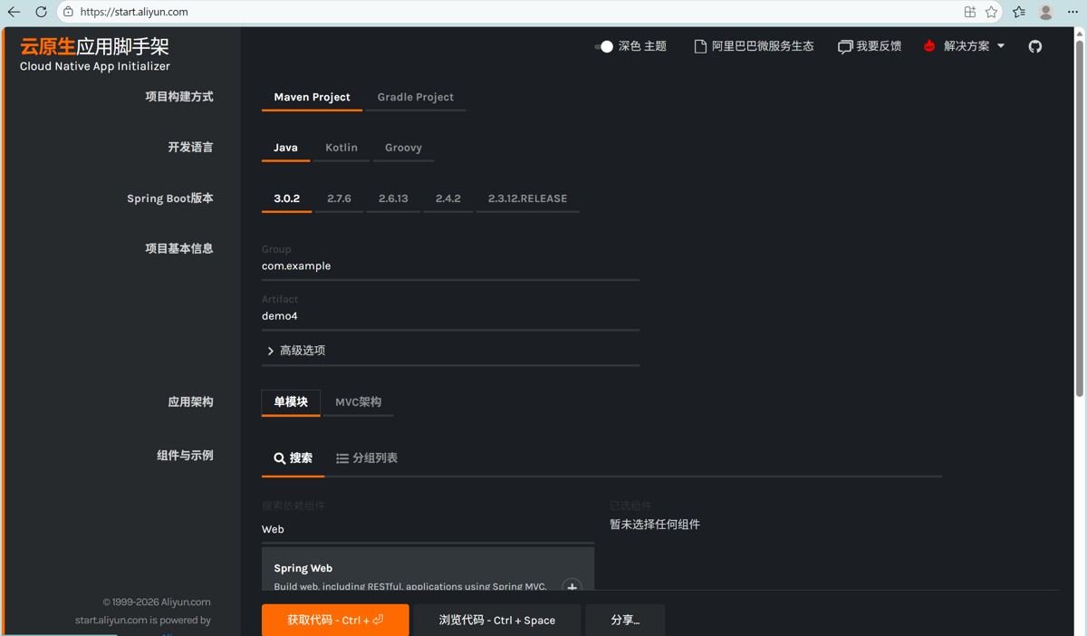 优点:完全不依赖 IDEA 版本(社区版也可使用);国内访问速度极快,依赖下载稳定;操作流程与官方在线方式一致,新手易上手;支持阿里云专属依赖(如 Nacos、阿里云 OSS 等)。缺点:需手动切换浏览器操作,比 IDEA 直接集成多一步解压导入,效率略低;仍需联网操作。