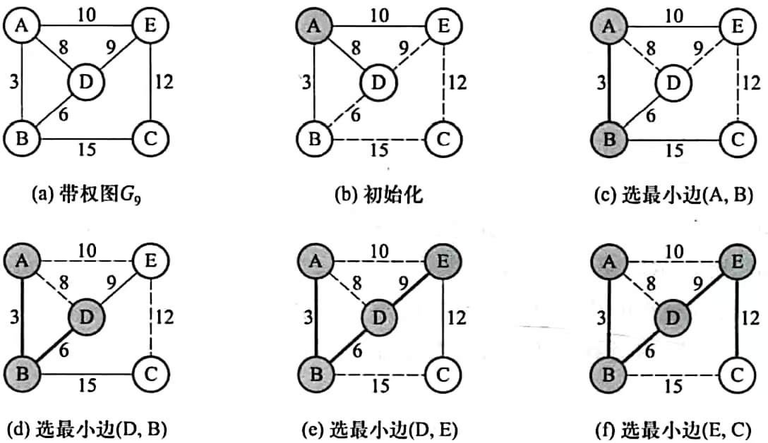 这种算法的思路是“从小到大选边”:将所有边按权值从小到大排序,依次选择最小的边,若这条边连接的两个顶点不在同一个已连通集合中,就将这条边加入生成树;否则跳过,避免形成环。重复此过程,直到选够n−1条边。