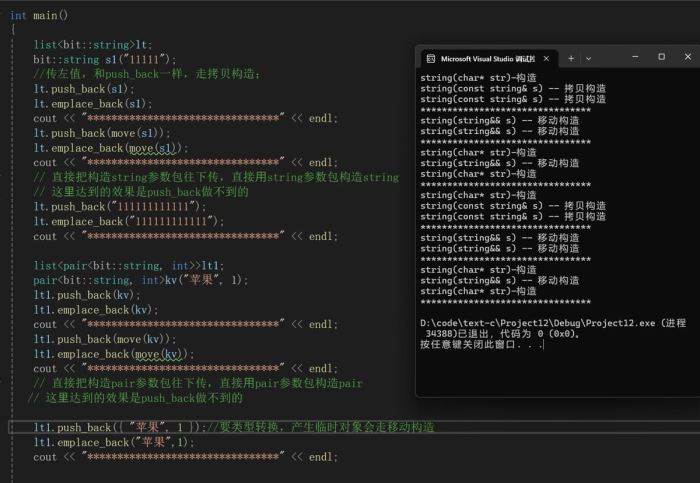 • 第⼆个程序中我们模拟实现了list的emplace和emplace_back接⼝,这⾥把参数包不段往下传递, 最终在结点的构造中直接去匹配容器存储的数据类型T的构造,所以达到了前⾯说的empalce⽀持 直接插⼊构造T对象的参数,这样有些场景会更⾼效⼀些,可以直接在容器空间上构造T对象。
