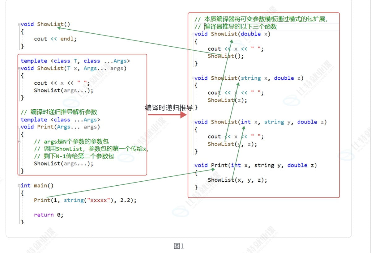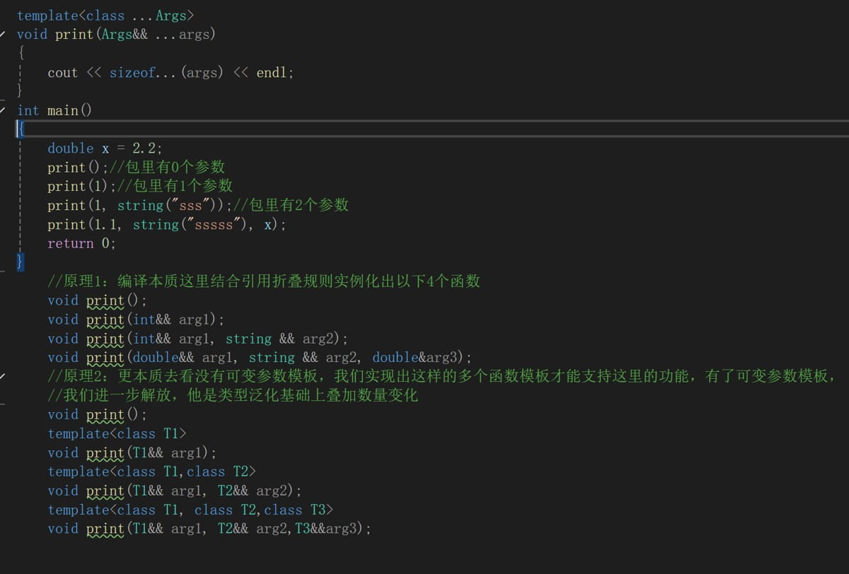 • 可变参数模板的原理跟模板类似,本质还是去实例化对应类型和个数的多个函数。