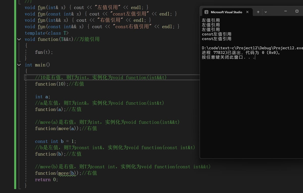• Function(T&&t)函数模板程序中,假设实参是int右值,模板参数T的推导int,实参是int左值,模 板参数T的推导int&,再结合引⽤折叠规则,就实现了实参是左值,实例化出左值引⽤版本形参的 Function,实参是右值,实例化出右值引⽤版本形参的Function。