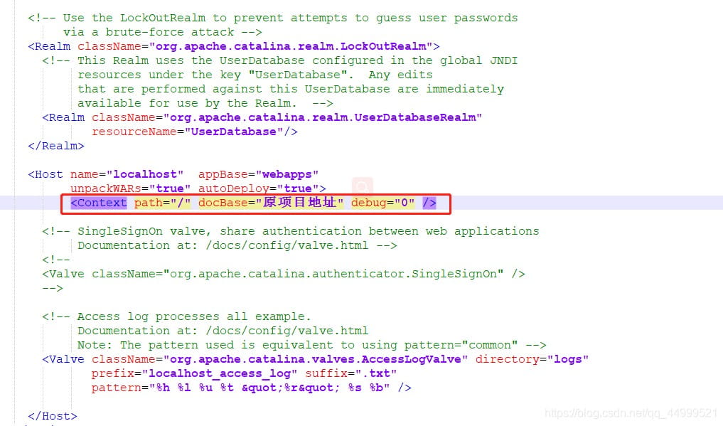 # path : / 表示不需要项目名 # docBase:项目路径 这里写相对路径、相对webapps、不要问我怎么知道的 appBase有指定 <Context path="/" docBase="项目地址路径" debug="0" />