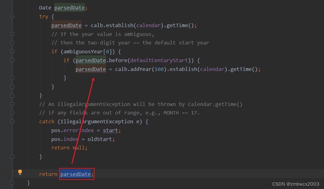 可以看到该方法很长,但是我们只关注返回如何结果,直接拉到最后查看该方法如何返回一个日期格式 。上图中,最后一次修改parseDate对象是在箭头的位置。那么我们查看getTime()方法。