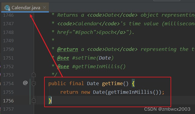 可以看到该方法是由Calendar类提供的,该类名翻译为中文就是日历的意思,并且返回结果也是我们需要的日期格式,那么我们就可以确定该方法用于给parseDate对象提供返回值的,接下来回退一下查看其他方法哪个是提供Calendar对象来调用getTime()方法的。