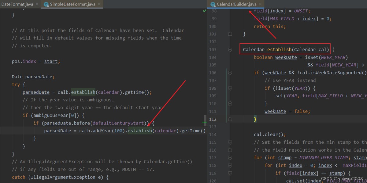 此时我们或许大概明白是因为SimpleDateFormat类之所以线程不安全的问题是因为在多线程下共享了calendar对象。接下来我们继续查看establish()方法,验证是否是这样,下面是具体源码