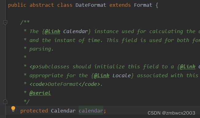 现在我们清楚了Calendar类对象是由establish()方法提供的了,该方法中需要一个参数calendar对象。该对象由SimpleDateFormat的父类DateFormat来维护。