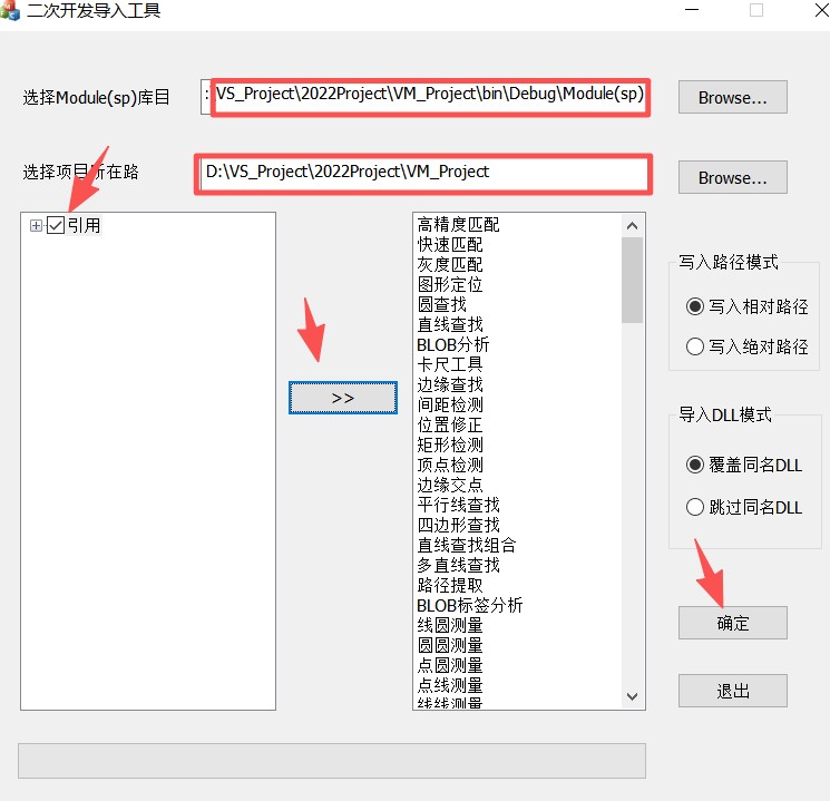 启动二次开发导入工具("D:\MVS\test\VisionMaster4.0.0\Development\V4.0.0\ComControls\Tool\ImportRef.exe”) ,Module(sp)的路径在生成工程Debug下的 Module(sp)文件夹,项目所在路径为bin文件的上一层,在选择完指定的路径之后,需要选择引用模块的dll以及是否选择相对路径,最后点击确定,完成环境配置。