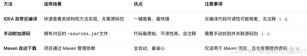 - 善用反编译:对于没有源码包或只是快速查看逻辑的情况,IDEA 自带的反编译功能非常强大且足够使用。