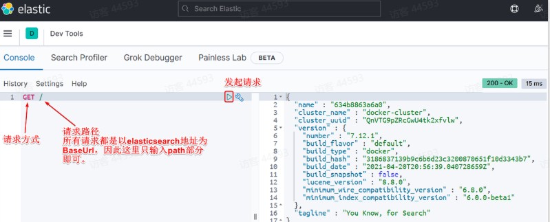 访问9200端口,即可看到响应的Elasticsearch服务的基本信息: