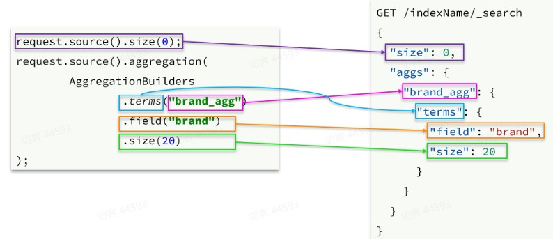 不过聚合条件的要利用AggregationBuilders这个工具类来构造。DSL与JavaAPI的语法对比如下: