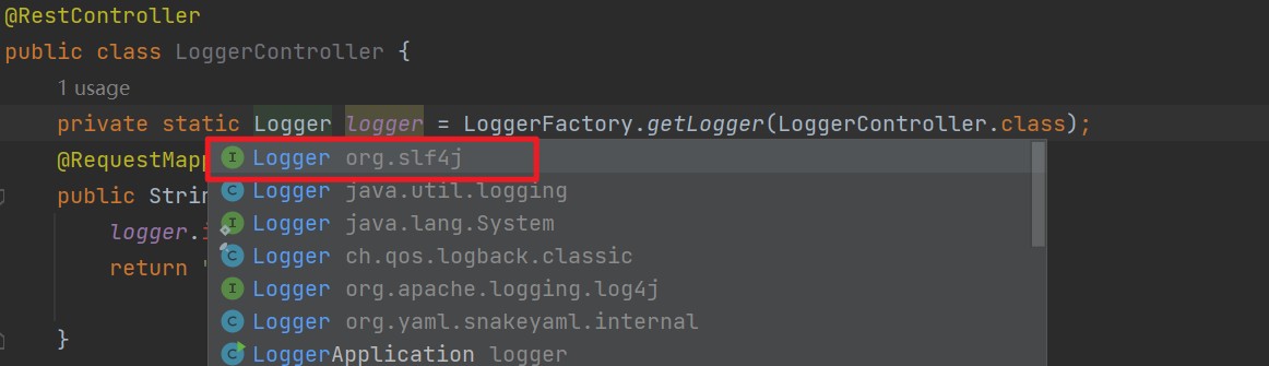 private static Logger logger = LoggerFactory.getLogger(LoggerController.class);