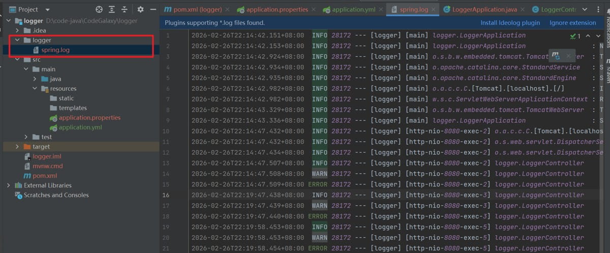 我们刷新后就可以发现在logger这个目录下出现了 Spring.log (日志文件的默认名称)这个日志文件 (注意: logging.file.path: 只能设置日志文件的路径,不能设置文件名称)
