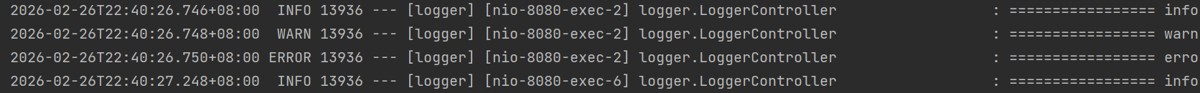 我们发现 debug 和 trace 级别的日志没有被打印---这与⽇志级别的配置有关,⽇志的输出级别默认是 info级别(下面的内容中会讲到如何配置), 所以只会打印⼤于等于此级别的⽇志,也就 是 info , warn 和 error.