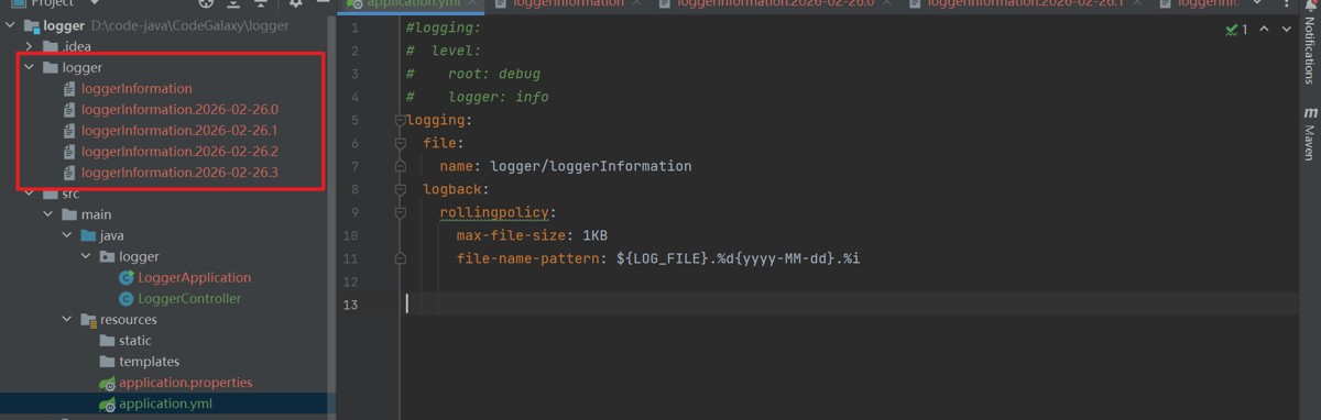 1. 日志文件超过1KB就分割(设置1KB是为了更好展示.企业开发通常设置为200M,500M等,此处没 有明确标准)