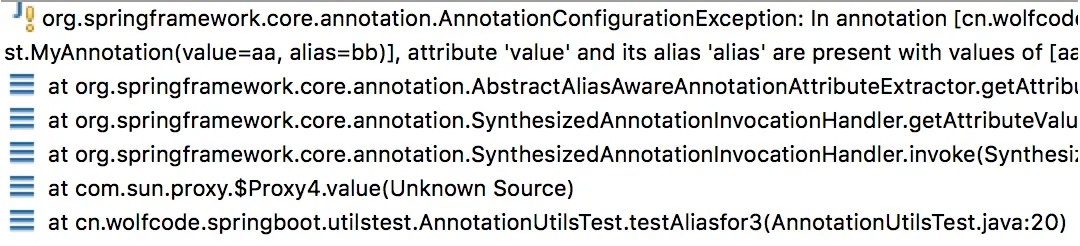 }我们将MyAnnotation放在AnnotationUtilsTest上,可以看到,我们故意将value和alias值设置为不一样的,然后在测试代码中分别获取value()和alias()的值,结果打印: