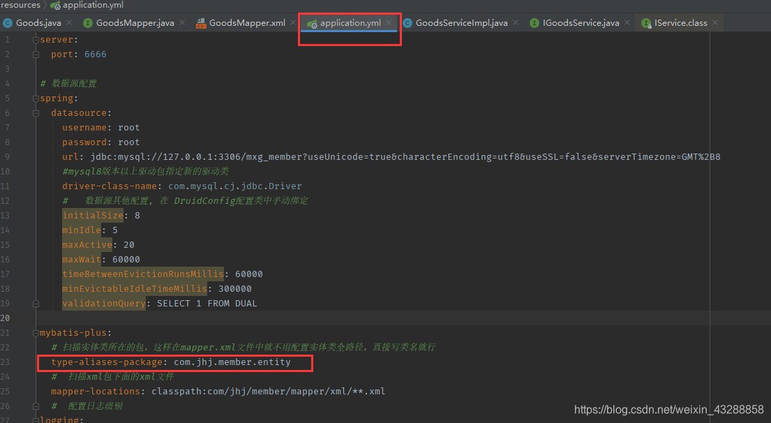 mybatis-plus: # 扫描实体类所在的包,这样在mapper.xml文件中就不用配置实体类全路径,直接写类名就行 type-aliases-package: com.jhj.member.entity # 扫描xml包下面的xml文件 mapper-locations: classpath:com/jhj/member/mapper/xml/**.xml # 配置日志级别