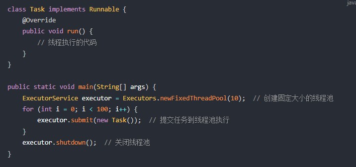 Java 5 引入的java.util.concurrent.ExecutorService接口和其他类,提供了线程池的支持,避免了查询和创建线程,可以通过Executor的静态方法创建不同类型的线程池、提高了线程管理效率
