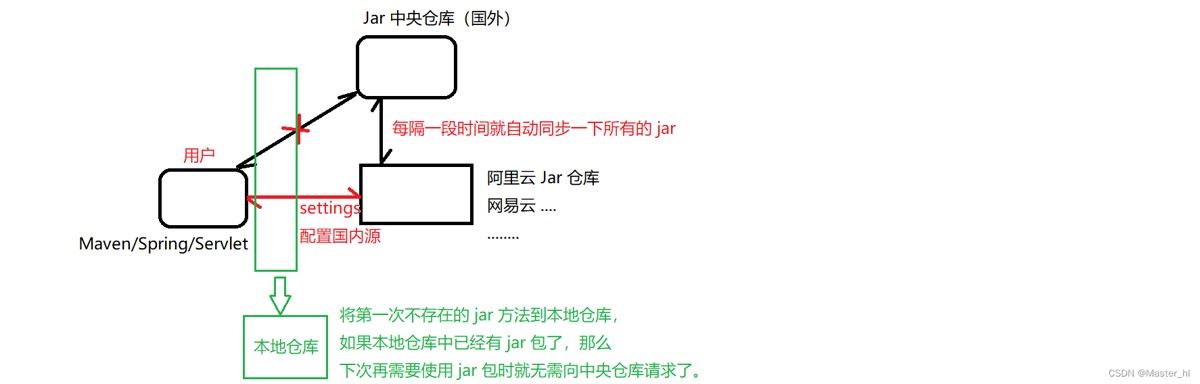 最早我们在下载 jar 包的时候,是没有本地仓库的,我们需要本地仓库就从线上去拉,拉完就放到我们的项目里面,但是这里会有一个问题,比如我们下载一个 mysql 的 jar 包,我们第一次去拉去这个 jar 包,这个项目已经创建完了,第二次我们在写项目的时候,还需要 mysql 的 jar 包,又得从中央仓库去拉,此时就会有两个问题,不管是国内的还是国外的,我们都需要消耗网络资源. 而且第一次我们已经下载好了,此时我们本地项目已经有了 jar 包,第二次我们又去下载,不科学不合理,这个为了减轻中央仓库的负担,也为了加快本地下载的速度,所以它就会在中央仓库和用户之间架一个本地仓库,起的作用就是缓存 !!