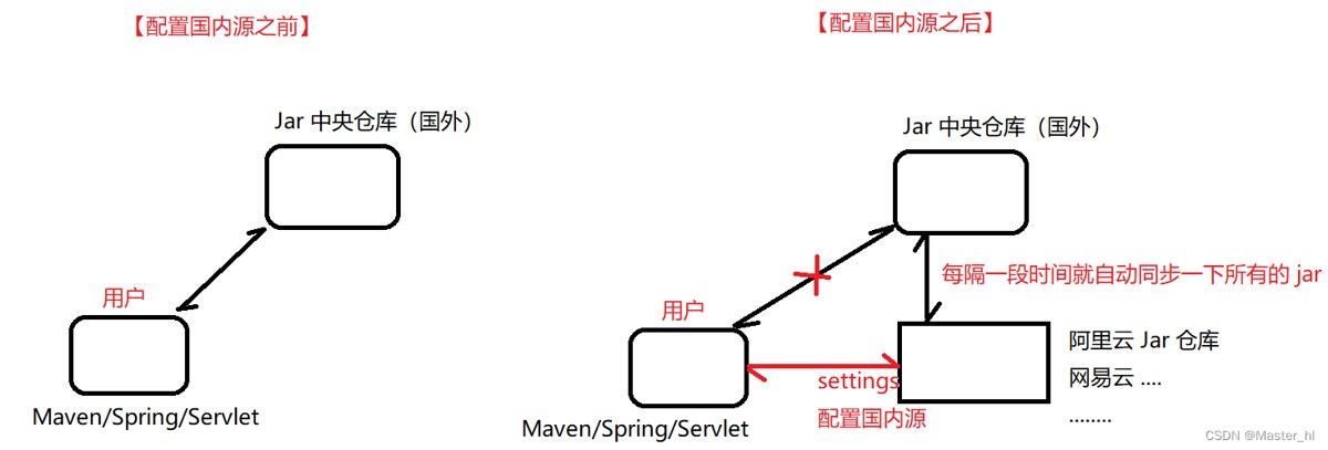 由于 Maven 中央仓库在国外,这就导致一个问题,为什么我创建 servlet 项目,创建 spring 项目的时候,我创建失败了,就是因为你去拉这个中央仓库的时候,它在国外,然后国外网络不好,导致你拉了一半,或者是在默认的超时时间里,你都没有把这个 jar 包下载下来,或者下载的时候网络中断了,下载了一个一半的 jar 包,然后你运行的时候就出现问题了,你发现你的项目就跑不起来,就是这个原因. 为了解决问题,于是三方就跳出来了,国内比较典型的 jar 包有两个,一个是阿里云,一个是网易云,前边第一种情况配置的国内源就是阿里的.