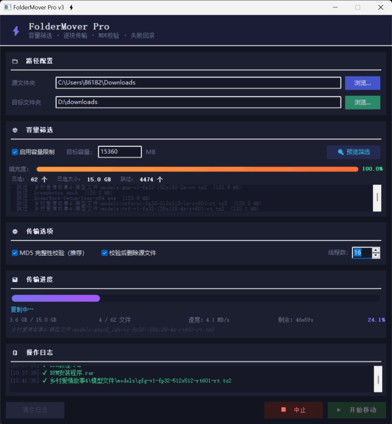 以下为移动 62 个文件(共 15 GB)时的典型日志输出: