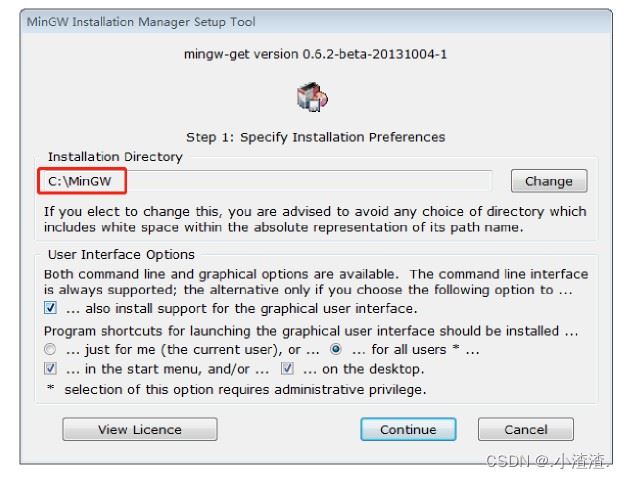 可根据自己操作系统的实际情况,自定义 MinGW 的安装位置( 建议安装到非C盘的指定目录下 ),然后点击“continue”。