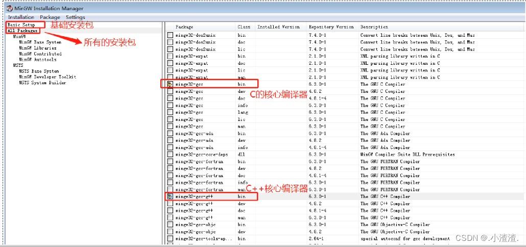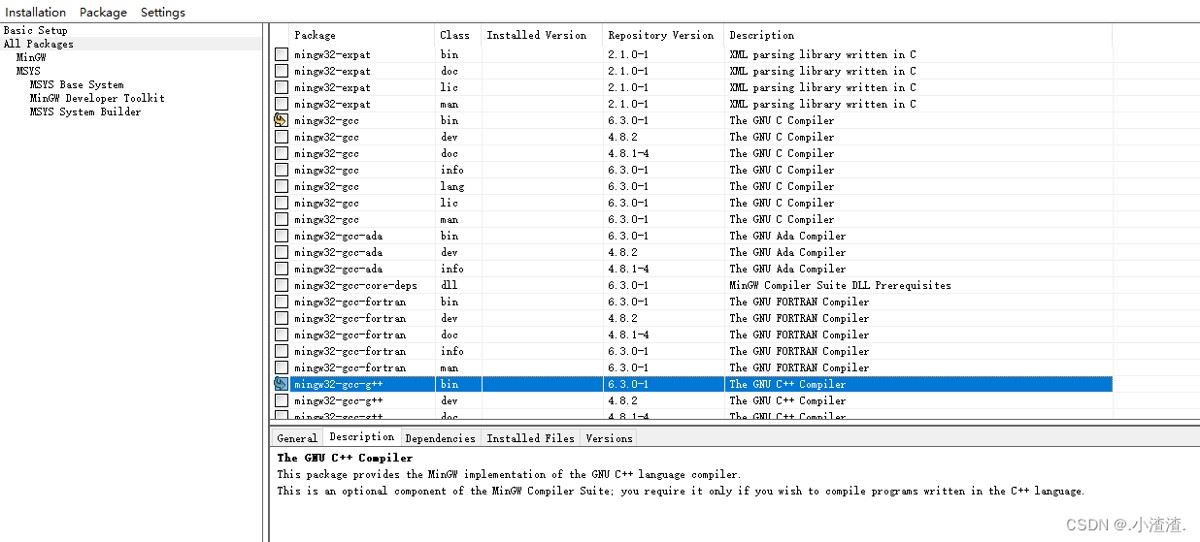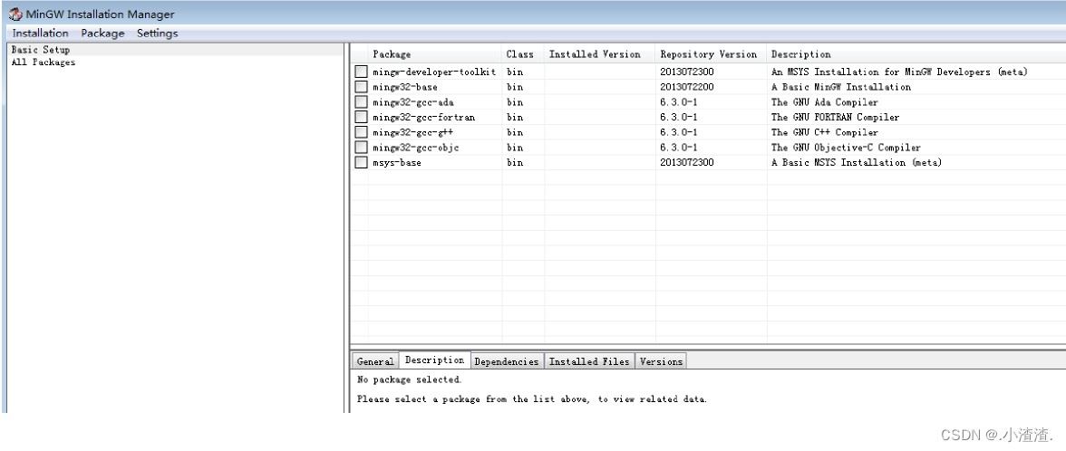 安装完成之后,继续点击“continue”,进入下面的对话框,这是一个名为 “ MinGW Installer Manager ” 的软件,借助它,我们可以随时根据需要修改 GCC 编译器的配置。