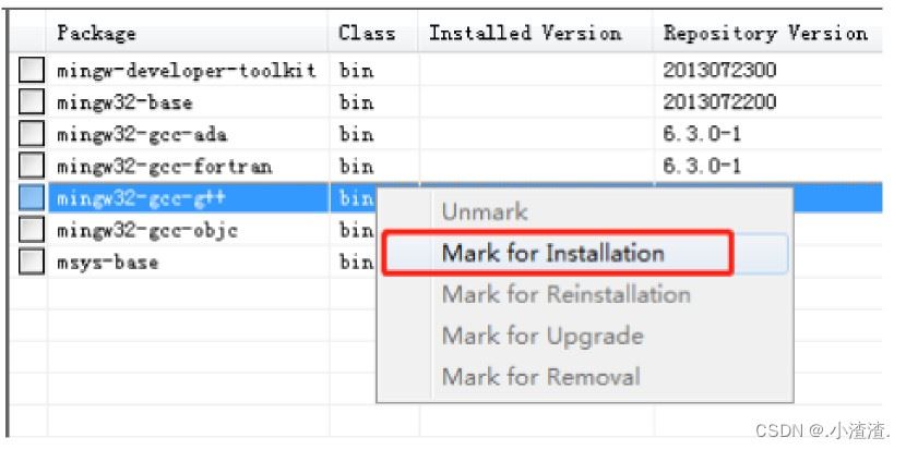 为使 GCC 同时支持编译 C 语言和 C++ ,需勾选上图中标注的 2项。选中其中一项,鼠标右键点击,选择“Mark for Installation”,如图所示。