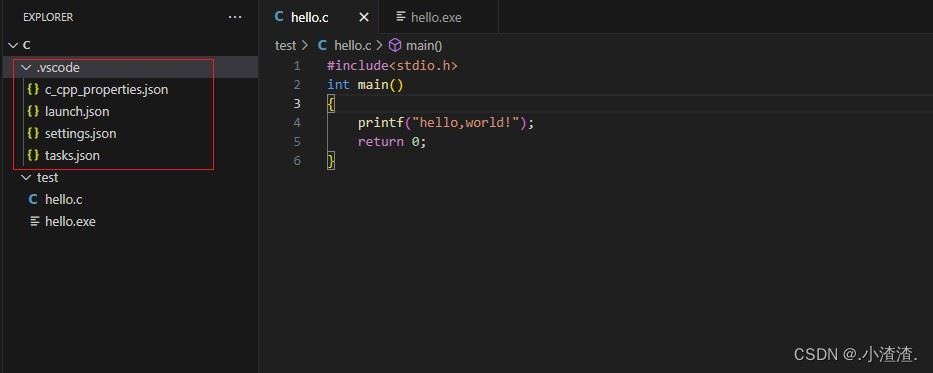 运行 hello.c 文件后会生成一个 .exe 文件,并且还有一个 .vscode 配置文件夹。里面有一个任务的 json 文件