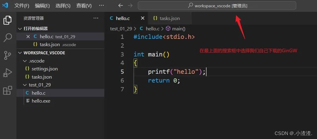 运行 hello.c 文件后会生成一个 .exe 文件,并且还有一个 .vscode 配置文件夹。里面有一个tasks.json 文件