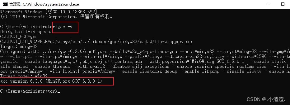 打开命令行窗口(通过在搜索栏中执行 cmd 指令即可),输入 gcc -v 指令,如果输出 GCC 编译器的具体信息,则表示安装成功,例如: