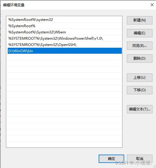 依次 右击计算机(我的电脑) -> 属性 -> 高级系统设置 -> 环境变量 ,例如我将其安装到了D:\MinGW文件夹中,因此 PATH环境变量的设置如下: