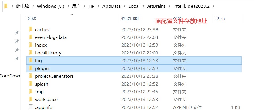注意:原配置文件电脑上存放位置"C:\Users\HP\AppData\Local\JetBrains\IntelliJIdea2023.2"